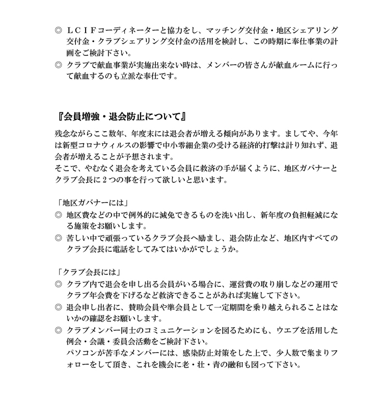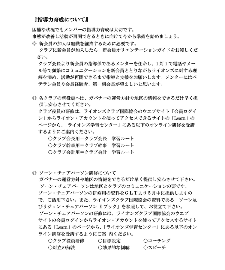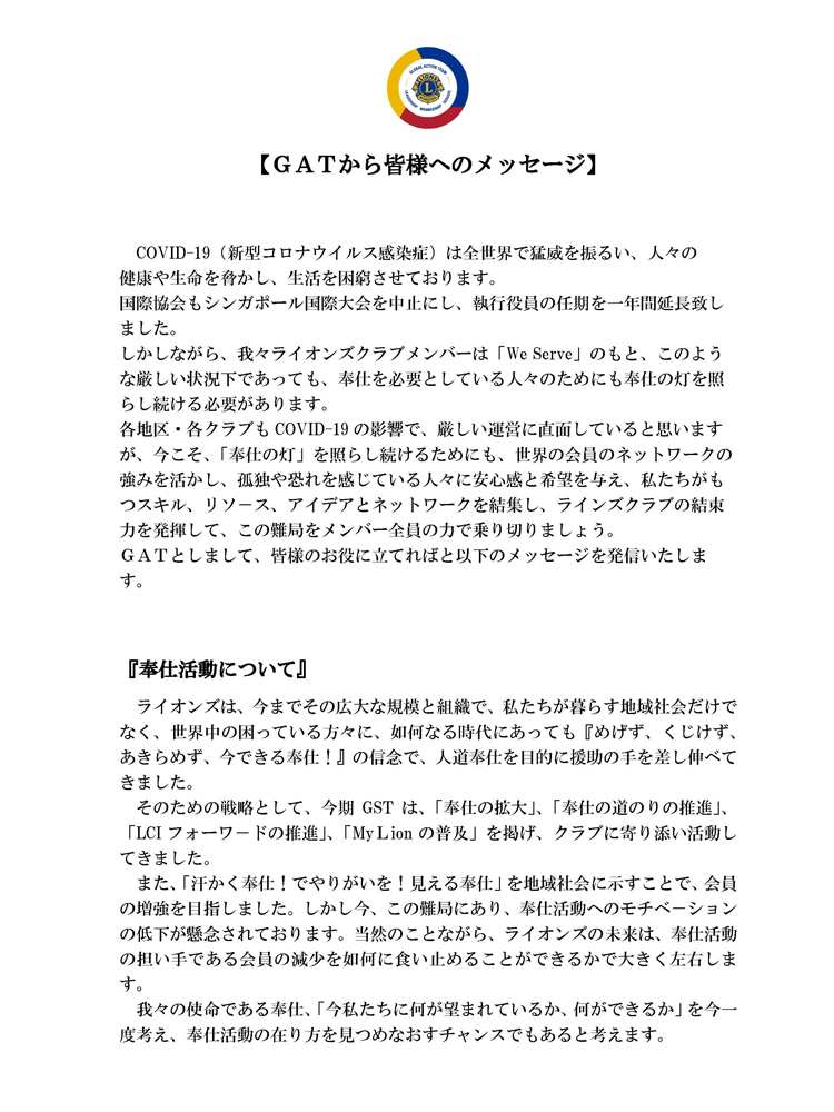 新型コロナウイルス感染拡大の影響で、各地区・クラブが厳しい運営を迫られている状況を受けて、日本GAT(中村泰久日本全域リーダー)は5月22日、クラブに向けてメッセージを発信した。メッセージではライオンズクラブの結束力を発揮してこの難局を乗り切ろうと呼び掛け、奉仕活動、会員増強・退会防止、指導力育成について、それぞれ具体的な方策を提示している。