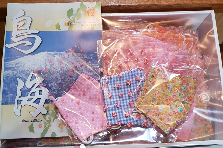 そこで正木会長が、独り暮らしの高齢者や大内地区のデイサービス利用者を対象に、会員が手作りしたマスクを社会福祉協議会大内支所を通じて寄贈してはどうだろうかと提案。私たちは4月上旬から約1カ月の時間を掛けてマスク作成に取り組んだ。これからの季節を考慮して夏向きの生地で作ることにし、材料を調達。地元の衣料店からは「ボランティア活動の手助けになれば」と、少ない在庫の中から晒(さらし)などを快く分けて頂き、目標のマスク100枚を仕上げることが出来た。例会では慣れない手作業でマスクを一枚一枚ラッピングし、新型コロナウイルスに対する注意喚起のメッセージカードを添えて完成させた。
