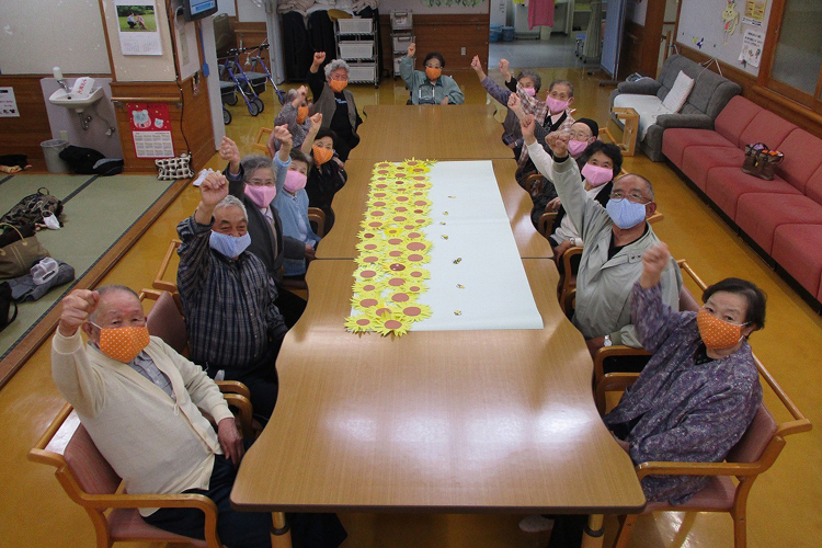 数日後、手作りマスクは地元の高齢者施設へ届けられた。岩谷地区にあるデイサービス高台苑施設利用者の皆さんからは、笑顔でピースサインをしている写真が、また上川地区のさつき苑施設利用者の皆さんからはガッツポーズで元気いっぱいの写真が、当クラブへ送られてきた。こうして高齢者の皆さんからの写真やメッセージを頂き、この活動の達成感を得ることが出来た。