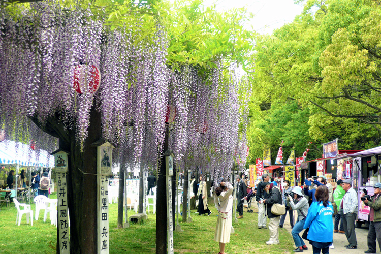 そんな状況で誌面に載ることになったのが、中津沖代ライオンズクラブのメンバーには残念でならなかったらしい。祭り終了後の6月、大阪福島ライオンズクラブでのだふじ再生事業を主導した藤三郎さんを招き、藤棚整備の指導を受けた。それからは例年以上に熱意と愛情を注いで手入れした結果、翌19年には1mを超える花房が芳香を漂わせ、祭りの主役の座を取り戻した。第17回中津みなとふじまつりでは、その花を思う存分楽しんでもらおうと広場に100席分のガーデンテーブルセットを配置し、新緑の中でゆったり観賞してもらった。前年から一転、来場者からは「今までで最高の花付き」と称賛の声が上がった。