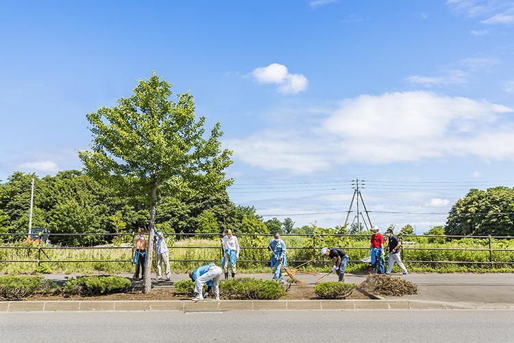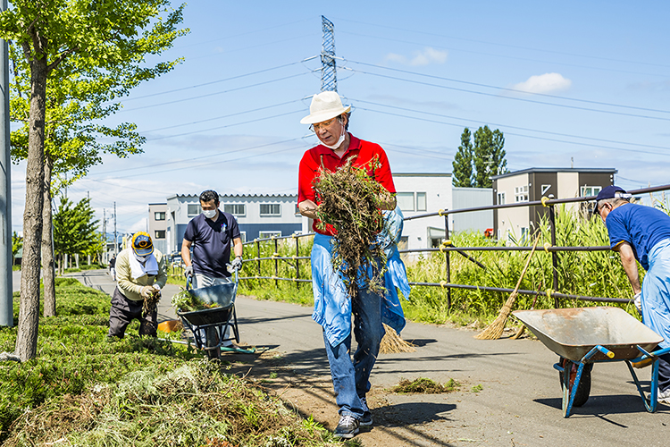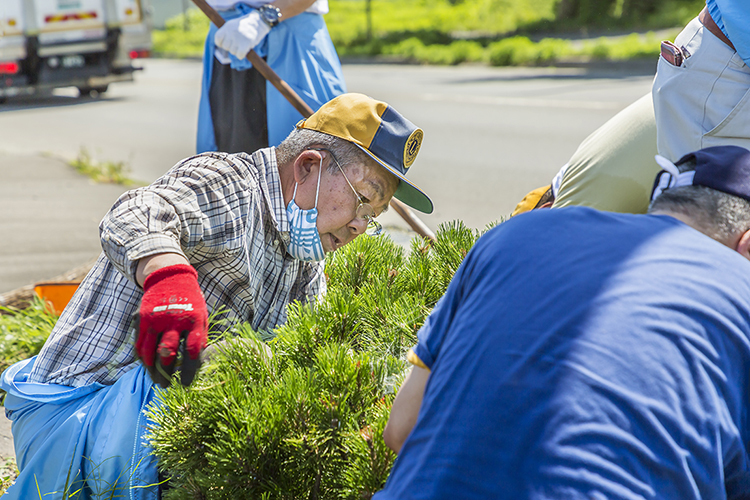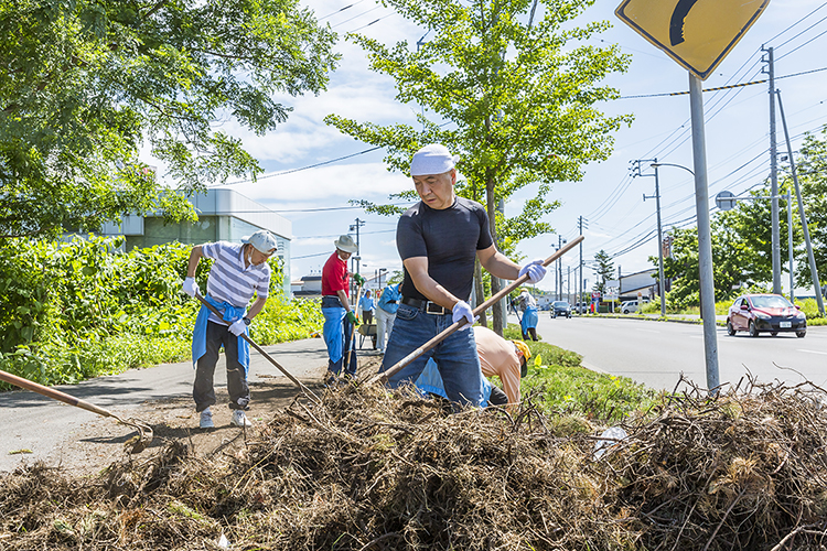 この北海道道273号花畔札幌線で街路樹の剪(せん)定、ゴミ・雑草撤去を実施しているのが石狩ライオンズクラブ(花田和彦会長/33人)である。2008年に始め、以降毎年実施している。今年も7月19日に行った。当日は最高気温が30℃近くまで上がる晴天。メンバーたちは熱中症にならないよう、途中給水を挟みながら作業に従事した。今年は新型コロナウイルス感染拡大の影響で中止も議論されたが、外で行う事業であることと、雑草が伸び続けてしまうことから実施を決めた。