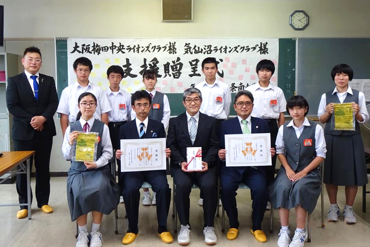 大阪梅田中央ライオンズクラブの益田前会長から「40周年記念事業として気仙沼のために支援したい。将来の気仙沼の役に立つような支援は何がよいだろうか」と相談があり、気仙沼ライオンズクラブが地域の必要性と将来に向けて有効に活用してくれる支援先を検討することになった。気仙沼市立条南中学校は東日本大震災では津波の被害を受けながらも避難所として被災した住民を受け入れ、自衛隊の駐屯地として校庭を提供する中で、地域の子どもたちの教育を続けた。現在は宮崎明雄校長を中心にICT教育にも尽力されている。そこで同校を支援先とし、プロジェクターを寄贈することにした。