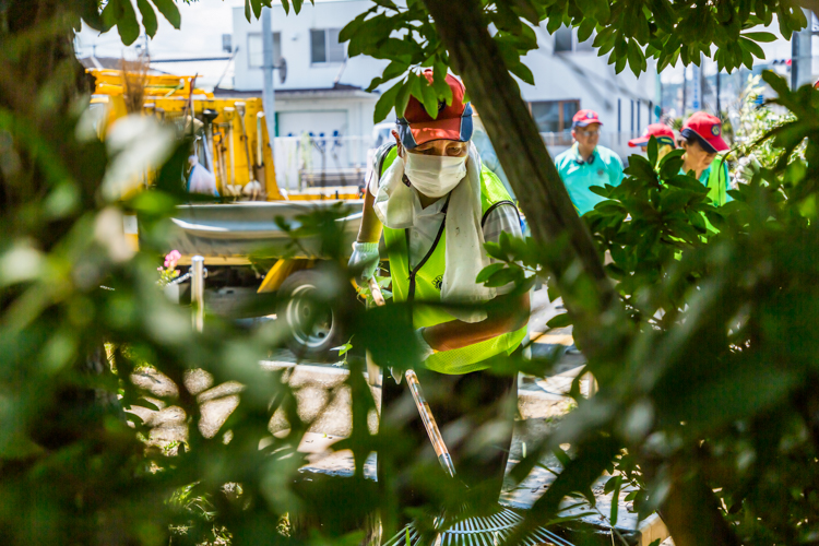 街角オアシス整備作業に参加するのは多治見陶都ライオンズクラブのメンバーだけではない。街角オアシスを管轄する多治見市緑化公園課と道路河川課に協力を要請すると共に、市内の造園業者、長尾造園に剪定の箇所や、やり方などの指示を受けて実施している。代表取締役の長尾純夫氏は1995年に岐阜県が創設した「岐阜県緑の博士(グリーンドクター)」の最高ランク3A級の資格を保持。樹木保護の専門技術士として認定されており、環境や土壌条件などを考慮に入れて指示をしてくれる。また、造園のスタッフは炎天下での作業に慣れているため、地面に水をまいたり、休憩のタイミングを見計らったり、ともすればがんばりすぎてしまうメンバーの様子を見てサポートしてくれるのも心強い。