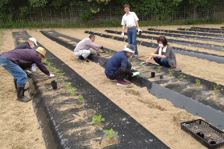 6月6日、同事業所に午後4時に集合。事業所敷地内にある畑を借りて、苗の植え付け作業を行った。落花生栽培の経験者が植える間隔などを指導し、参加した会員は楽しく作業を進め約1時間で終了した。畑の管理は引き続き会員の事業所にお願いした。