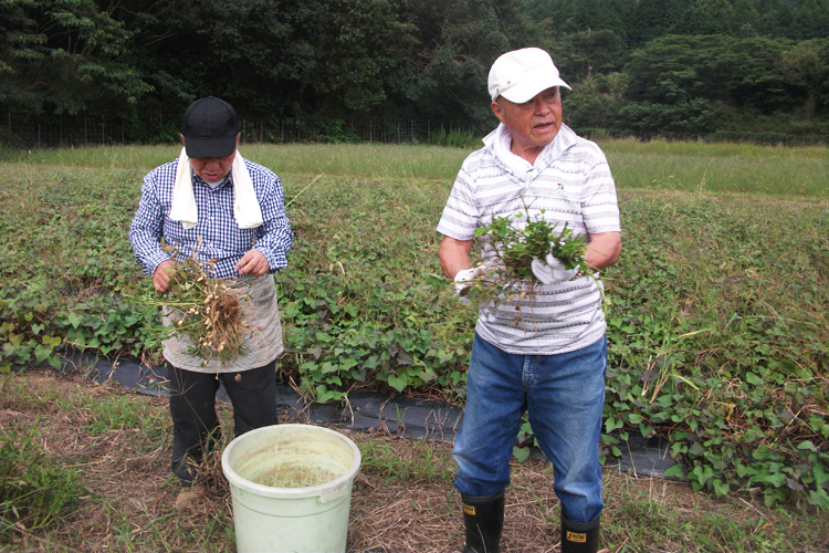 9月25日、落花生の収穫の日を迎えた。事前に地域の幼稚園に声を掛けていたのだが、8月下旬に落花生の葉の部分を鹿に食べられた影響で実のなりが少なそうなことと、新型コロナウイルス感染防止のために、今回は園児との共同作業は中止し会員のみで収穫することにした。作業自体は特に難しいことはなく、スコップで掘り起こし苗を引き上げると土の中から落花生が出てくるので手でもぎ取っていく。鹿の食害に遭ったにもかかわらず思った以上に実が付いていて、作業を行う会員からは笑顔があふれていた。