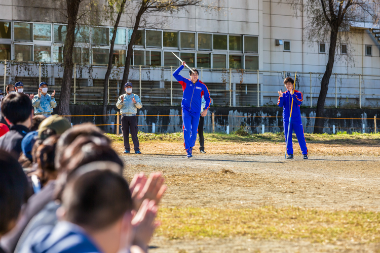 そして11月9日。この日は朝から快晴で、寒くもなく、暑くもない、理想的な天気となった。聖地公園グラウンドの入り口には児童生徒が手形や折り紙などでデコレーションした横断幕を張り、拍手で新井選手と、同じスズキアスリートクラブ所属の長沼元(げん)選手を歓迎。新井選手はやり投の用具の説明などの後、模範演技としてやりを投げる。手拍子の中、投げたやりは広いグラウンドの反対側へ。その飛距離と迫力に子どもたちは大興奮の様子だった。