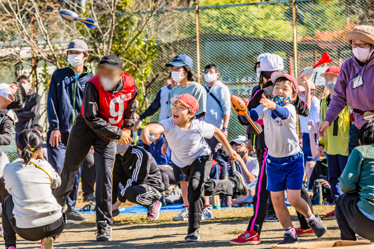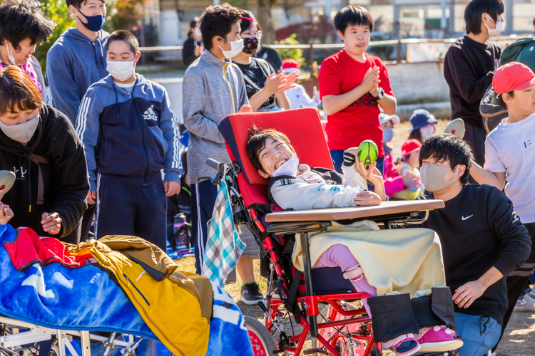 その後は実技体験。当初は小学部、中学部、高等部、さくら棟、それぞれから5人ずつ計20人が体験する予定だったが、新井選手の厚意により、全員が体験出来ることに。危険なので投げるのはやりではなく、ターボジャブや、その前身に当たるヴォーテックスという投擲具だ。一斉に投げ、それを回収し、次の人へ渡す。ヴォーテックスやターボジャブはうまく飛ばすとピューっと音が鳴る。新井選手と長沼選手が手本を見せ、その音を空に響かせていた。車椅子の子どもたちも、特別支援学校の先生やスタッフに助走を付けてもらい、投擲。予定よりも長く体験の時間を取ることが出来たため、何度も挑戦する子もおり、最後は支援学校の先生やスタッフ、ライオンズクラブのメンバーも加わり、普段出来ない体験に皆笑顔になっていた。