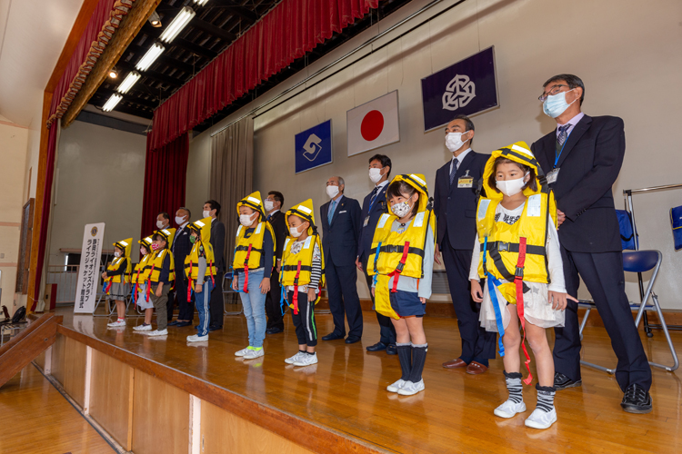 当初、中島小学校での贈呈式は全校生徒を集めて行う予定だったが、新型コロナウイルス感染症の影響で1年生だけを体育館に集めての実施となった。今年の贈呈数は3校合わせて195着。新入生の人数分だ。これを毎年続けることで、ゆくゆくは全校生徒分のライフジャケットを寄贈する構想だ。贈呈式では壇上に上がった児童たちにメンバーがライフジャケットを着せる。児童からは感謝の言葉があり、和やかな雰囲気で終了した。