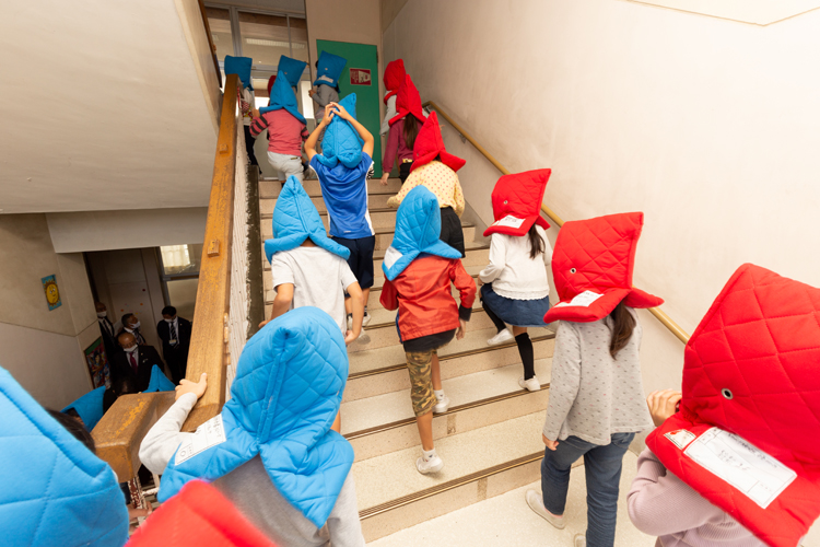 11時30分からは全校で避難訓練。恒例行事であったが、こちらも新型コロナウイルスの影響で延期になっていたことから、クラブと学校側との協議の上、贈呈式の日に合わせて実施することを決めた。避難訓練前には各クラスで先生が避難時の注意点を伝えていたが、ここで目立っていたのが、児童たちの避難についての理解が深いことだ。それもそのはずで、中島小学校は防災意識が非常に高い小学校なのである。先生たちの危機管理意識が高く、学内でハザードマップを作成するなど積極的な取り組みが評価され、2018年には静岡県から知事褒賞を授与された。また学校単体だけでなく、地域住民や近隣にある中島中学校と協力して定期的に防災訓練をしている。