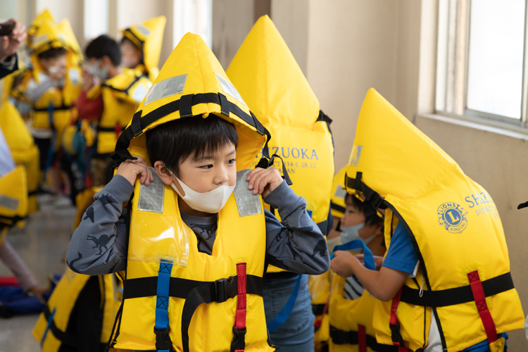 静岡ライオンズクラブ(望月晴生会長/131人)は南海トラフ地震を意識し、昨年から沿岸部にある小学校にライフジャケットを寄贈している。昨年は静岡市立中島小学校のみだったが、2年目となった今年は、対象を市立大里東小学校、市立長田南小学校を加えた3校に拡大。10月27日には中島小学校で贈呈式を行い、その後実際にライフジャケットを児童に着用してもらう避難訓練も併せて実施した。