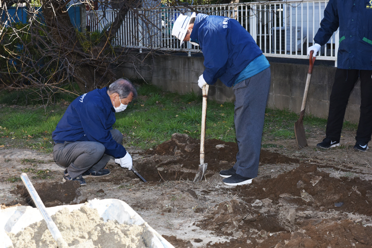設置工事には、クラブ・メンバー20人程がスコップなどを持参して取り組んだ。が、時の鐘周辺の土は想像以上に硬く、結局ユンボ(ショベルカー)を持ち出して、半日以上掛けて終了した。
