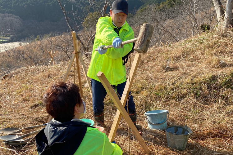 1月31日(日)午前9時から大森山桜園において、愛媛県南予地方局愛南土木事務所所長及び係長、南レク㈱南宇和管理事務所所長、南宇和高等学校ボランティア部1、2年生、一般市民、そして当クラブから埜下会長、竹村和也55周年大会委員長、会員の計23人で植樹式を実施した。温かな日差しの下、若い苗木の根を傷つけないように気を付けながら、鹿沼土と腐葉土、水を交互に入れ、風で倒れないように杭を打ち、全員が協力して丁寧に作業を行った。