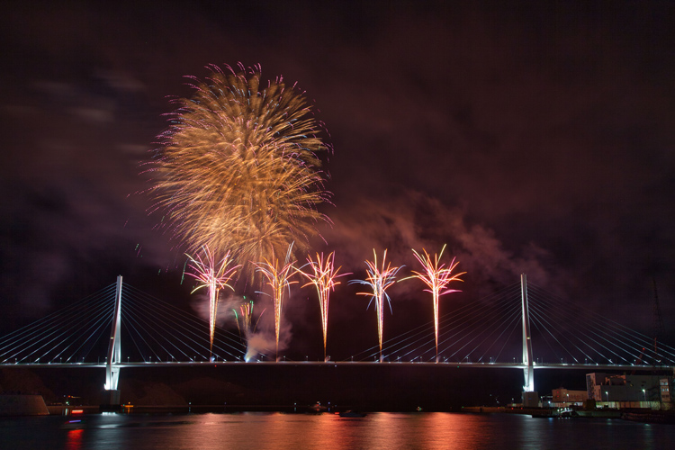 コロナ禍での対策も講じ、観覧会場は設けずに、「思い思いの場所から同じ夜空を見上げてほしい」とした。コミュニティFM局とも連携し、生放送のラジオ番組から花火に合わせた楽曲を流し、車内のカーステレオでBGMを聞きながら花火を楽しめるように工夫した。また全国、全世界への感謝の発信ということもあり、インターネットでのライブ配信も試みた。そして夜7時、ライトアップされて白く浮かび上がった橋からナイアガラ花火が流れ落ち、続いて橋の上から約400発の花火が打ち上げられて、気仙沼湾の海面を色とりどりの光で染め上げたのである。