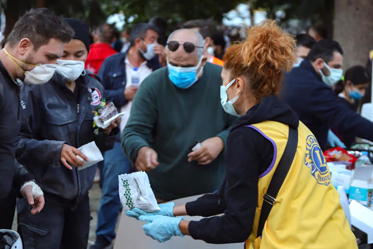 2020年10月30日15時、 マグニチュード7.0を記録したエーゲ海地震が発生。人口約400万人のトルコ第3の都市イズミルを強い揺れが襲った。イズミルにある16のライオンズクラブはレオクラブと協力し、地震発生の1時間後には支援態勢を整え、3時間以内に拠点となるブースを崩壊したアパートの裏に設置した。新型コロナウイルスが勢いを増す中、人々を感染から守るための対策も極めて重要な課題だった。その日の午後6時には被災者や捜索救助隊メンバーのために、飲料水や消毒液、また15万枚用意したマスクの配布を開始。7時には温かいライスとチキンスープが何千もの人々に提供された。