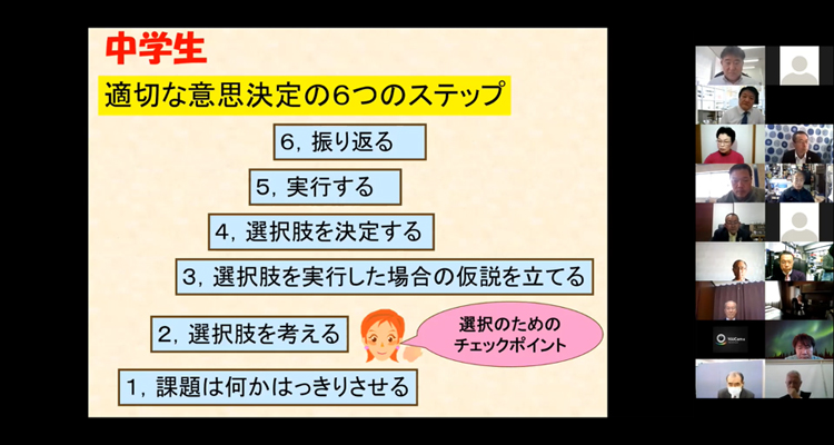 続いて、ライオンズクエスト未経験者向けにプログラムの具体的な内容が説明された。幼稚園・保育園のプログラムで扱う内容から始まり、中学生・高校生のプログラムまで徐々に発展していく内容が示された。参加者から「このプログラムが最も効果を発揮する年齢・学年はどこか」という質問があり、これに対しては「出来るだけ早い段階から繰り返し行うことが大切」という講師の見解が示された。テキストの改訂やワークショップ開催方法の説明の後、安心して人が集まることが難しい現状を踏まえ、オンラインでのワークショップやセミナーの開催方法や例が示された。