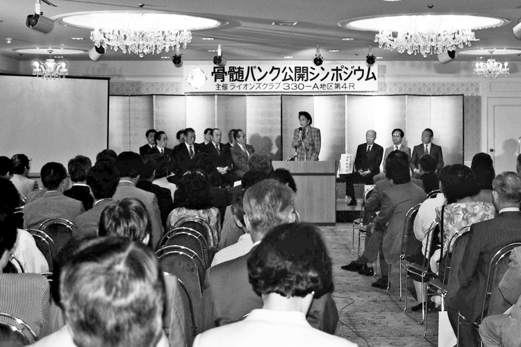 1980年代後半には、化学療法と骨髄移植の併用により白血病患者の5年生存率が70~80%まで上昇し、同時に公的骨髄バンクを求める機運が全国的に高まっていった。そしてついに1991年、財団法人骨髄移植推進財団(日本骨髄バンク)が設立されたのである。翌92年には、330-A地区(東京都)4リジョンが骨髄バンク事業開始記念・公開シンポジウムを開催。共催の全国骨髄バンク推進連絡協議会の会長に内定した海部幸代さん(海部俊樹前総理<東京センチュリー ライオンズクラブ>夫人)へ活動資金を贈呈した他、骨髄移植についての基調講演や骨髄提供者による体験発表などが行われた。