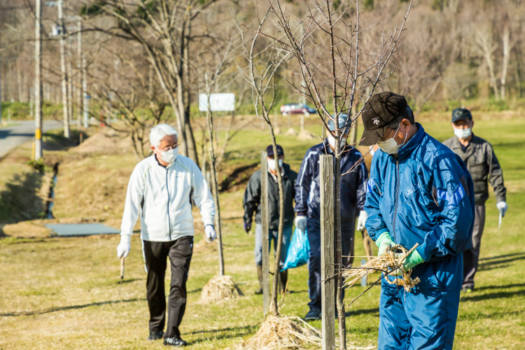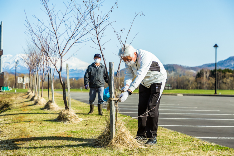 町から紹介されたのが、09年にオープンしたきのこの里パークゴルフ場だった。北海道のパークゴルフ場では桜が植えられていることが多く、話はスムーズに進んでいった。しかし、土壌が問題となる。パークゴルフ場の植樹予定地は木が育ちにくい土だったのだ。そこで、町が土を提供してくれた。重機を使って元の土と入れ替えて整備したのは愛別ライオンズクラブの面々である。こうしてクラブが自らの手で整えた場所に植えられたのが100本の桜だった。