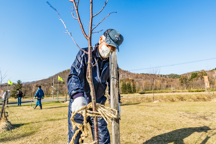 愛別町では毎年1.5mほどの雪が積もる。そのため、放っておくと桜は雪の重みで折れ、朽ちてしまう。そこで桜の木を保護するため毎年10月末に杭を打ち、縄で固定し、4月末にそれを取り除くる。この作業は専門の業者であるメンバーの指導を下に行っている。今年も4月23日に杭を外す作業を行った。メンバーは鎌を持ち、手早く縄を解いていく。打ち込まれた杭を外すと共に、桜の状態を調べていた。