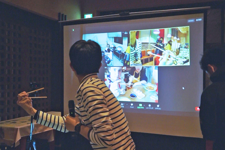 そして迎えた当日。萩、長門の高校生はルネッサながとにある「リストランテ・アンジェラ」に、秋芳の中学生は赤郷公民館にそれぞれ集合した。16時30分から設営を開始。17時からは両会場をオンライン接続し、調整や確認をして18時の開会を迎えた。しかし、いきなり接続のトラブルが発生。急きょメンバーのスマートフォンでZoomに接続することになった。それでも両国の生徒たちは複数回の打ち合わせで既に顔なじみになっていたこともあり、そんなトラブルをものともせずに、打ち解けた様子で会話を交わす。オンラインゆえの多少のタイムラグや中断を苦にせず、活発に発言し、率直に意見を交換。調理や味付けには慣れていないようだったが、互いに身ぶり手ぶりを交えて悪戦苦闘しながら説明していた。約2時間という短い時間だったが、参加した生徒たちは非常に濃密な時間を過ごしたようだった。
