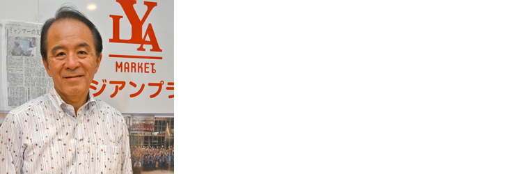 この金色のお釈迦様はミャンマーで制作され、今年1月に博多港に到着しました。ミャンマー軍によるクーデターが発生したのは、それから間もなくのことです。その後3月に、私が組合長を務める福岡市博多区の吉塚市場に完成した御堂に釈迦像を安置し、開眼供養を行いました。吉塚市場はJR博多駅から一駅という便利な場所にありますが、周辺に大学が多くて比較的家賃が安いので、アジアを中心に海外からの留学生が大勢暮らしています。昨年9月から、外国人との共生と、市場の活性化を目指して「リトルアジアマーケット」としてリニューアルを進めており、釈迦像は市場に集うアジア各国の人たちの心のよりどころにしてもらおうと、私が長年通っているミャンマーからお招きすることにしました。東南アジアの人たちは、こういう金ぴかのお釈迦様でないと手を合わせる気持ちにならないのだそうです。