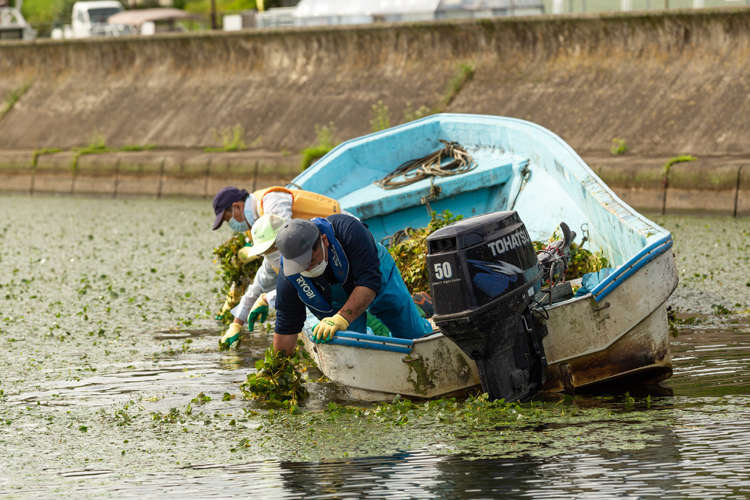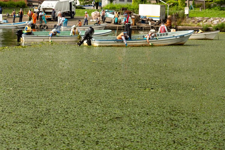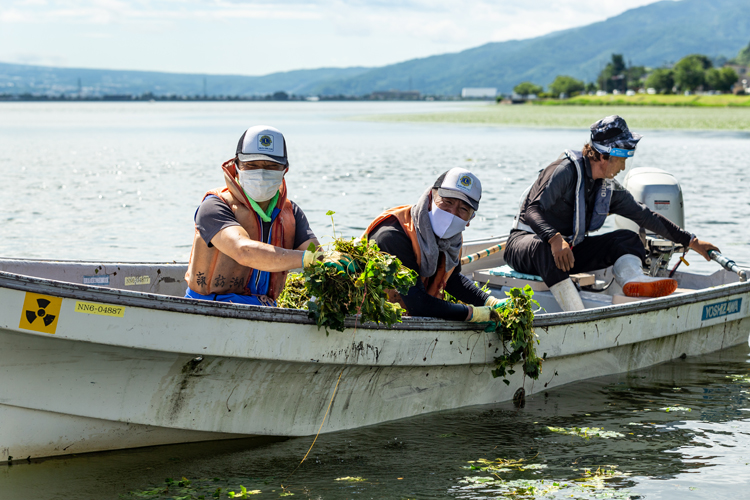 諏訪湖では手刈り、水草刈り取り船と合わせて年間500tを超える量を除去しているが、それでもヒシが湖岸に沿って群生している。この日も2時間ほどで約3tを抜き取ったが、まだまだ先は長い。今年は7月5日に水草刈り取り船による除去作業がスタート。アルゼンチンとイタリアのボート競技代表選手たちが東京オリンピックの事前合宿を諏訪湖で行うため、その練習コースから始め、9月にかけて510tを刈り取る予定だ。