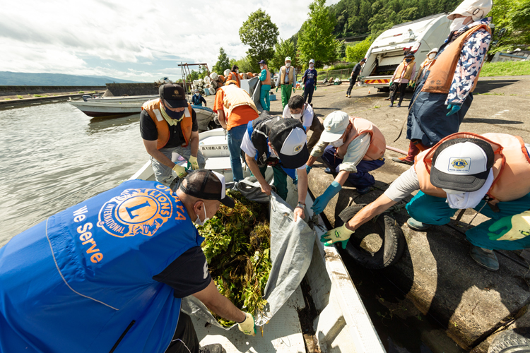 わずか10分の作業でも引き抜くヒシの量は舟に山盛りになるほどだ。今年度334-E地区(長野県)のガバナーを務める諏訪湖ライオンズクラブの増澤義治さんも地区役員メンバーと一緒に参加。岡谷ライオンズクラブのメンバーと共に懸命にヒシを除去していた。引き抜いたヒシは船着き場まで運んでパッカー車に入れていく。これらは有機肥料として再利用されることもあるという。