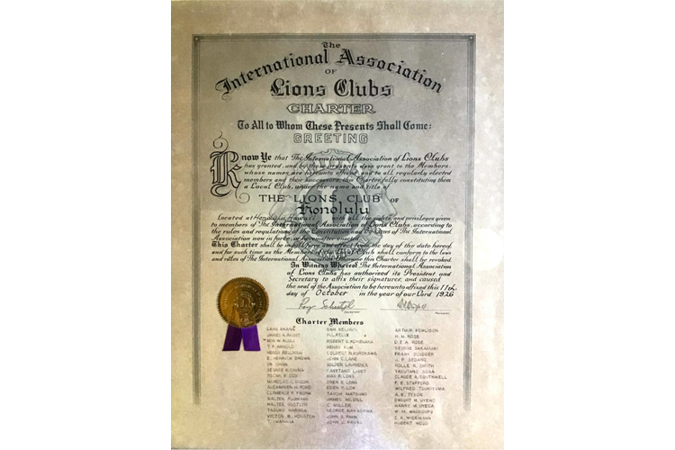 ホノルル ライオンズクラブが結成されたのは第二次世界大戦前の1926年で、カリフォルニア州のロングビーチ ライオンズクラブがハワイでのクラブ・エクステンションを働きかけて実現した。当時の国際会則ではメンバーは白人男性に限定されるという資格条件があったが、ハワイは日系人だけでなく海外からの移民が多かったため、後にチャーター・メンバーとなったコルベール・クロカワ(黒川直也)氏がアメリカ西海岸やカナダ・バンクーバーの日系人などに働きかけた結果、「白人のみ」とする規定が撤廃された。これにより、ホノルル ライオンズクラブは白人以外の会員が入会した世界初のクラブとして発足した。95周年式典にはクロカワ氏のお孫さんにあたる黒川民雄氏(千葉県・房総勝浦ライオンズクラブ)が出席され、祖父の思い出話を披露された。クロカワ氏は日本で晩年を過ごし、78年7月に88歳で永眠されたという。