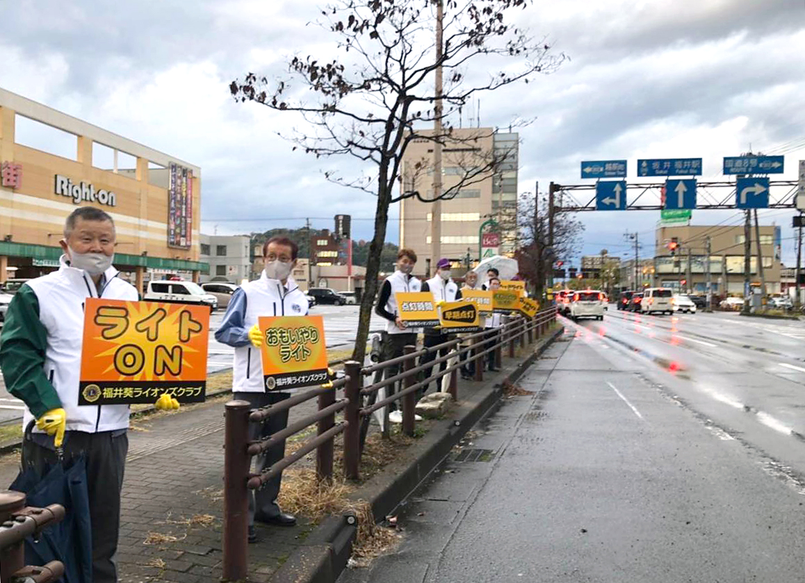 福井市ではこのところ交通事故が増えていることもあり、福井葵ライオンズクラブとして初めてこの運動に取り組むことにした。この日は、クラブ・メンバー14人が福井南警察署の署員と共に歩道に立ち、ドライバーに見えるように「ライトON」「おもいやりライト」などと書いた呼びかけパネルを掲げ、ヘッドライト点灯を呼びかけた。裏に「ありがとう」と書いたパネルもあり、ライトを点灯してくれたドライバーに見せて感謝を伝えた。