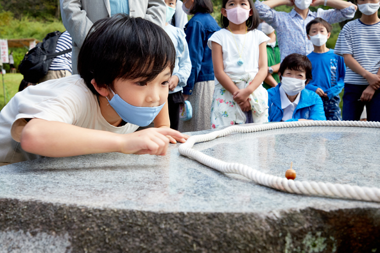 競技は、未就学児~小学校低学年、中学年、高学年と、中学生以上を対象とした大人の部に分かれて行い、部門ごとにタイムを競う。大きな石卓の上に土俵のように置いた縄の中で、一人3回ずつこまを回す。ライオンズ・メンバーは進行役とタイム計測の担当だ。完全に静止するまでのタイムを競うので、傾いたところで諦めてこまを取ろうとする子には「まだまだ、もう少しいける!」と声をかける。大人の部には保護者やライオンズ・メンバーが出場し、子どもたちの声援を浴びて童心に帰ってこま回しに挑戦。子どもも大人も一緒になって、くるくる回る小さなどんぐりの動きを見守った。