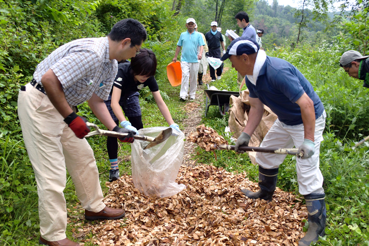 上山ライオンズクラブが最初に取り組んだのは、花咲山にある葉山コース上にウォーキング専用の道を新設すること。メンバーが山の中を歩き回ってのルート探しから始め、森林の中に細い道を開いて、2012年5月に「クロモジコース」と「こぶし平コース」を完成させた。二つの道はマンサクやナツハゼ、クロモジなどの落葉樹が茂り、初夏にはヒメサユリが足元を彩る林を縫うように進み、森林浴に最適のコースになった。これに加えて、横臥浴用の石ベッド、ウッドデッキ、クナイプ式井戸なども設置。これらはドイツのクナイプ療法に用いられる設備を参考にクラブで発案したもので、クナイプ式井戸は放置されていた井戸を再利用して作り上げた。