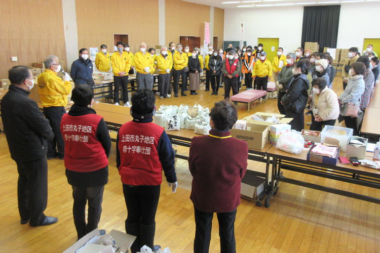 会場には、米、キャベツ、大根、リンゴ、ミカン、トイレットペーパーなど大量の食料品や日用品が所狭しと並んだ。灯油9L×50人分も事前予約を受けて用意した。長野県内外の企業35社の協力で届けられた真心の寄贈品だ。今回の活動の特長はさまざまな団体、人、地域がつながって実現したことである。まず、上田市社会福祉協議会、上田市連合婦人会、NPO法人ホットライン信州、社会福祉法人まるこ福祉会の4団体との初めての共同開催となった。更に、日赤奉仕団を始めとする15に及ぶ団体・会社等と共に強力な協力体制を築き、連携することが出来た。まさに当クラブの理念である「人と人がつながり、誰もが輝き、絆を深める地域社会の構築」だ。主催者である丸子ライオンズクラブはもとより、共催4団体の会員や職員が互いの立場を超えて協働し、この取り組みに汗を流してくれた。