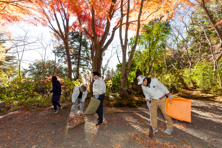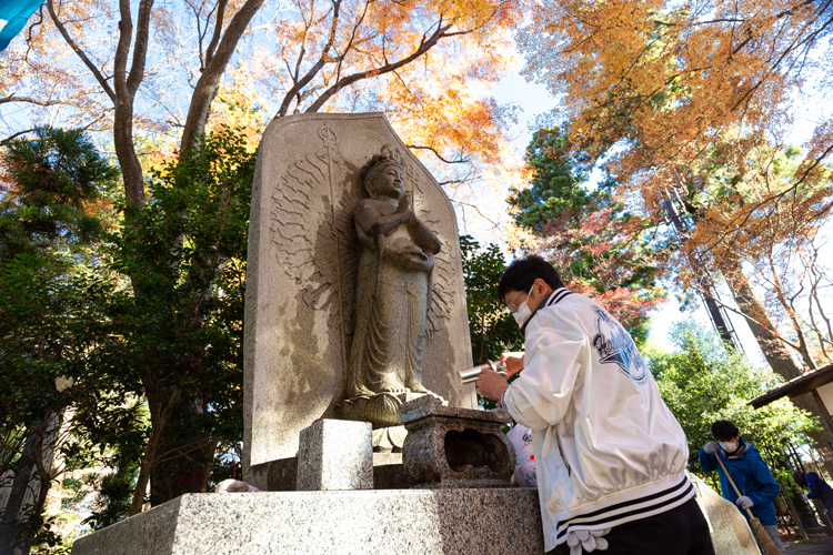 千手千眼観音像と献眼碑に水をかけ、汚れを落としていく。1年間に付いた汚れは思いの外多い。それらを丁寧に洗い流していく。また、多くの人が通るため、周辺の落ち葉を掃き集める。作業中は脇を通る観光客からメンバーが道案内を頼まれるケースも散見された。1時間ほどの作業を終えた後は、すっかりきれいになった像と碑に線香を手向ける。メンバー一人ひとり、献眼をしてくださった方に思いをはせて線香をあげ、手を合わせた。