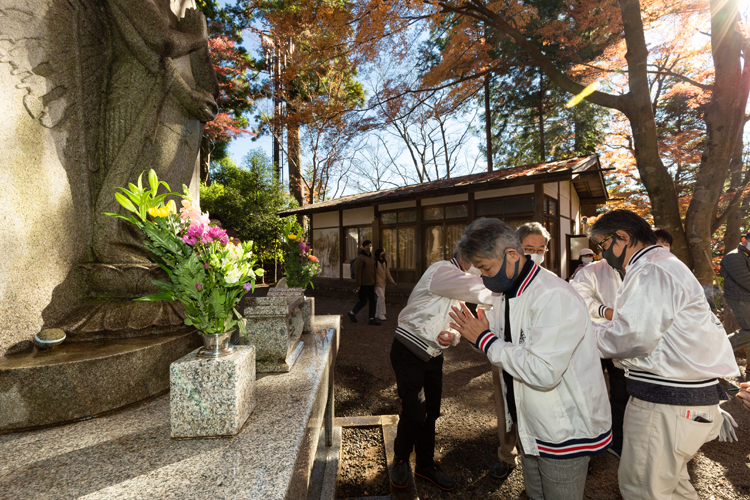 当時、高尾山薬王院の貫主を務めていた大山隆玄大僧正がクラブ・メンバーだったこともあり、話はスムーズに進んだ。大山貫主の働きで「男坂」と「女坂」の合流地点から坂道を登った先の広場に建立することとなった。広場の先には1930年にタイ国王室から寄贈された仏舎利塔もある。02年4月4日に地鎮祭を、11月30日に薬王院による開眼(かいげん)法要を行うこととなった。