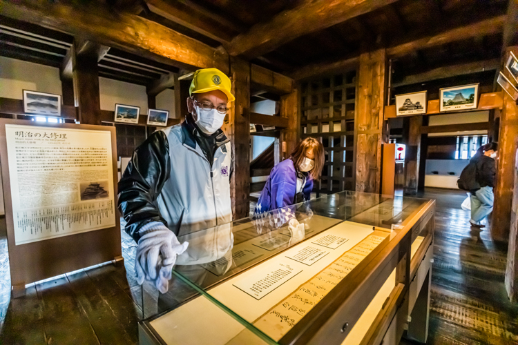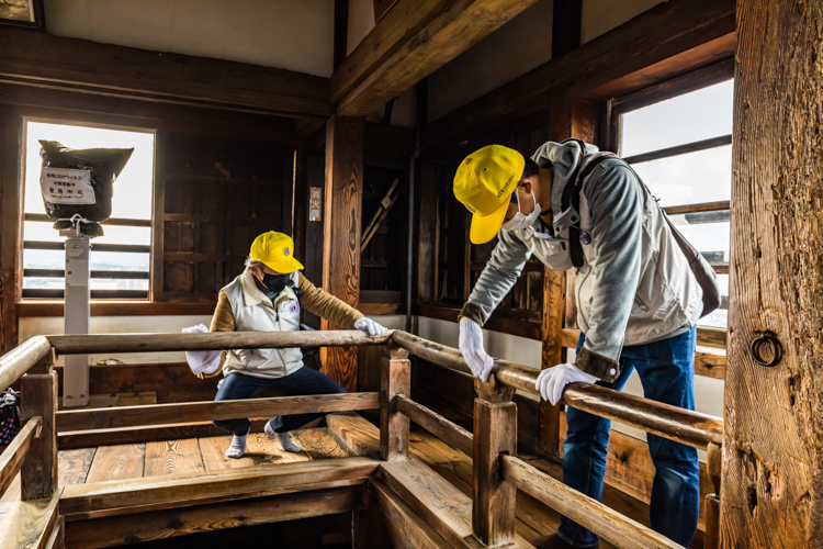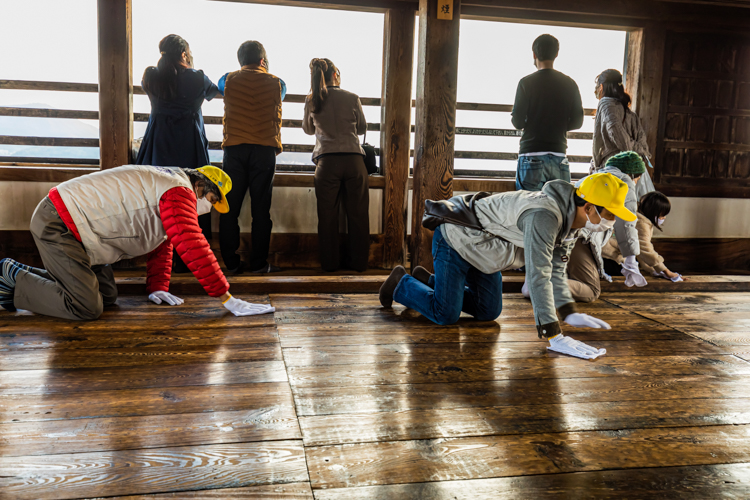 すす払いの後は天守閣に登り、乾いた雑巾で拭き掃除をする。メンバーは手分けして床、手すり、展示品が置かれているガラスケースなど、さまざまな場所をきれいにしていく。最上階を除いて城内は薄暗く、汚れも見落としやすいが、メンバーは隅々まで丁寧に作業を進めていた。松江城が国宝に再指定されてからは日常的に清掃が入るようになったため、観光客が増加していても比較的きれいな状態が保たれているという。
