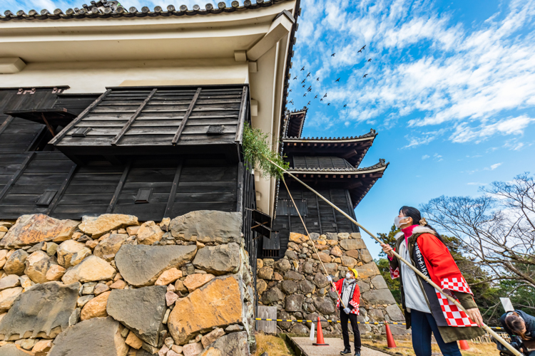 そして、年に一度、年末に行うのが天守閣のすす払いだ。今年度も12月12日に実施した。例年は一般からも参加者を公募して一緒に行うが、昨年と今年は新型コロナウイルス感染症の影響もあり、クラブ・メンバーとその関係者に限定した。コロナ以前の19年は100人程度を募集する大規模な事業だった。天守閣への登閣料が無料になることもあって、大変な人気だったという。