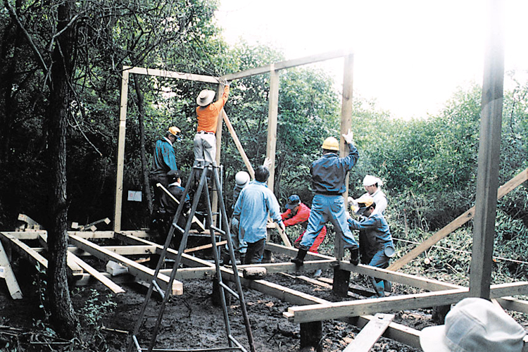 建設工事は野鳥の繁殖期である初夏と秋の渡りの時期を避けて、7月末から8月初旬にかけて実施。暑さとヤブ蚊に悩まされながら、体力勝負の作業となった。ネイチャーセンターの駐車場から現場までの散策路には車両や重機が入れない。そのため、解体した小屋の廃材や建設資材の運搬は人力に頼らざるを得ない。リヤカーを引き、角材を肩に担いで、片道約800mの距離を運んだ。また、建設地は地盤が軟弱なため、地中に1mの穴を掘り古電柱を埋めて基礎を固めた。準備段階を含めておよそ20日間で、高さ3mの高床式の「草原の観察小屋」が完成した。