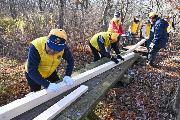 2021年11月6日、苫小牧ハスカップ ライオンズクラブは、建設から20年余りで土台の腐食が進んだ観察小屋の大規模な補修工事を行った。ウトナイ湖では近年乾燥化が進んでおり、観察小屋の建つ場所の地面も乾き、周辺の木々が大きく育っている。20年前のようにぬかるみで難儀することはなかったが、再建の時と同様に資材運びには苦労した。今回も岡部さんと加藤さんが先頭に立って作業を進めたが、柱の入れ替えは本職の大工に任せ、メンバーは資材の運搬や廃材の片付けなどを担当した。新しくなった柱には動植物に害のない防腐剤を施し、後日、修復した看板を設置して作業を完了した。この補修事業には、ライオンズクラブ国際財団(LCIF)の地区およびクラブシェアリング交付金60万円を活用した。