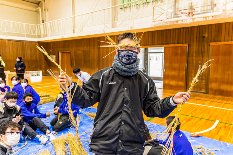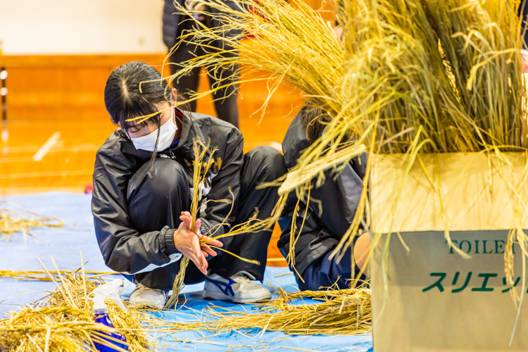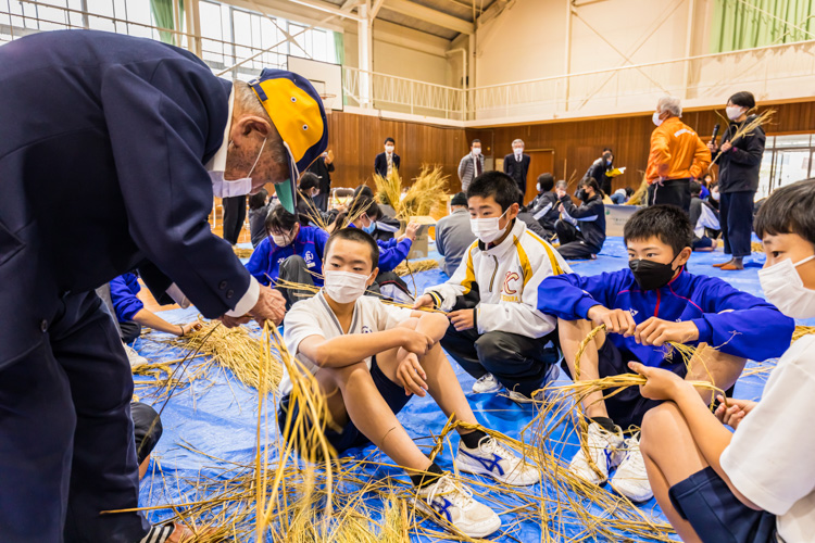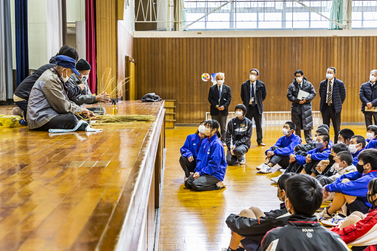 今年度のしめ縄づくり体験会では、ライオンズクラブのメンバー5人を含む地域の人たちが指導に当たった。例年は全校生徒を対象にしていたが、今年度と昨年度は新型コロナウイルス感染症の影響で中学1〜2年生のみを対象にし、体育館で場所を広く取って実施した。