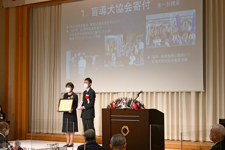 式典では、東京ライオンズクラブ結成から今日に至るまでの歩みを振り返る記録映像が披露された。荒牧会長はあいさつの中で、「映像を取りまとめる作業の中で、日本最初のクラブとしてその発展に尽力し指導的役割を果たしてこられたチャーター・メンバーを始めとする多くの諸先輩、スポンサー・クラブを始めとする国内外の関係クラブの情熱や高邁な精神に触れ、深い感銘を受けました。先人から受け継いだ灯を絶やさぬよう精進してまいります」と話し、ライオニズムを継承していく決意を表明した。また、山田實絋元国際会長からはビデオレターで、「日本で第1号のクラブとしてスタートして以来、多くの奉仕活動を行い、世界で困っている人への人道的奉仕に取り組まれてきたことに感謝します」と祝福の言葉が届けられた。