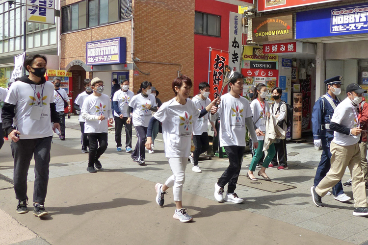 続くトーチランでは、平和記念公園から広島グリーンアリーナまでの約1.5kmを三つの隊列がリレーし、有森会長と大会サポーター、SOアスリートがトーチを掲げて走って、市民に大会をPRした。各隊列には地元・広島のライオンズ会員が2人ずつ参加した。トーチラン終了後は広島県立体育館で、47都道府県の各地区組織へ聖火を渡す分火式が開かれた。