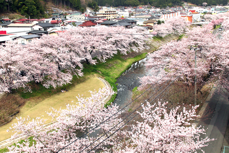 石川町は福島県南部、阿武隈山地の西にあり、町の中央を今出川と北須川が緩やかに流れている。春にはその水面を覆うように、川の両岸にピンクの桜が咲き誇る。昭和20年代に町役場の有志が今出川沿いにソメイヨシノ200本を植え、その後も町や町民が植樹を続けた結果、両川沿いは約2000本の桜が並ぶ名所になった。谷あいの川に幾重にも重なるような景観から「桜谷」と呼ばれ、今では近県だけでなく遠方からも桜観光のバスが訪れる。