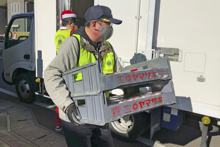 そして12月、子ども食堂にクリスマスケーキを届ける「ライオンズのサンタさん」には、地区内114クラブのうち77クラブが参加。子どもたちにプレゼントするショートケーキは、この事業の趣旨に賛同した山崎製パン株式会社が1万3600個を原価で提供してくれた。配布当日は各クラブが千葉市と松戸市にある山崎製パンにケーキを引き取りに行った他、工場から離れた地域のクラブの分は山崎製パン側の配送ルートで近くのコンビニまで運搬する便宜も図ってくれた。ケーキの購入費用はLCIF地区シェアリング交付金を活用するなどして地区が負担したが、中には独自に追加購入して配ったクラブもあった。