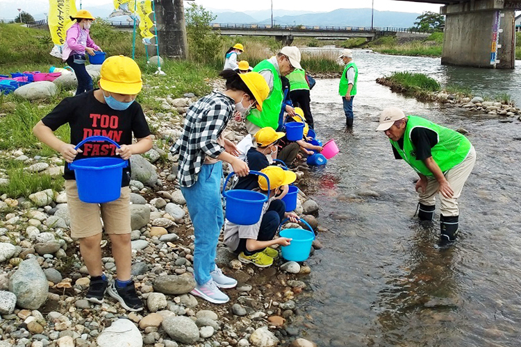 富山雷鳥ライオンズクラブ(内野忠会長/47人)は4月26日、富山市立熊野小学校の4年生約60人と一緒に熊野川でサクラマスの稚魚を放流した。今回で7回目になるこの事業は、子どもたちに川の水質浄化や環境保全の大切さを教えると同時に、サクラマスの回帰性など自然の仕組みを理解してもらうことを目的としている。残念ながらこの2年間はコロナ禍で実施出来ずにいたが、熊野小学校から「今年は何とかして実現してあげたい」という要望があり、我々の希望と一致した。この日放流するために、子どもたちは毎日稚魚の世話をして大切に育てているという話も聞いた。