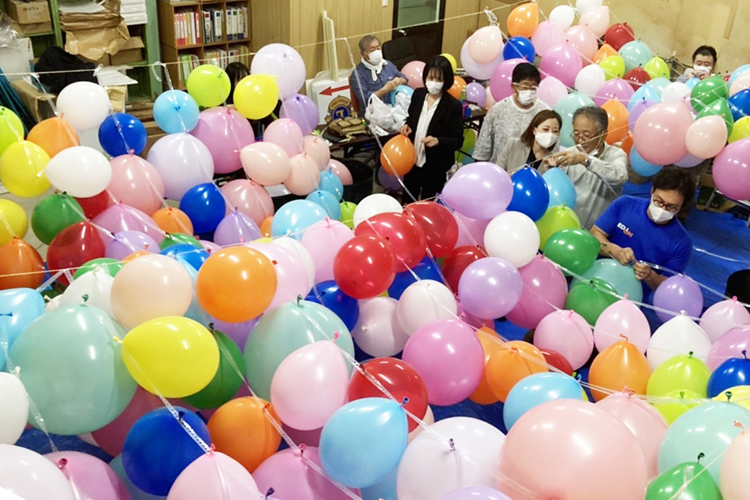 前例も、参考になる情報もない全く初めての試みなので、皆で知恵を絞り手探りで取り組んだ。2日間かけて用意した風船の数は合計4700個。風船を膨らませて縛る作業ではその数があまりにも多く、指先を痛めてしまったほどだ。出来た風船が割れないように室内に浮かせた状態で保管する工夫もしたのだが、クラブの倉庫と別会場の部屋がどんどんいっぱいになっていき、風船に埋もれながらの作業となった。モミの木に飾り付けた時に風に飛ばされにくくなるように、また効率よくまとめてくくり付けられるように、あらかじめ等間隔に穴を開けた長さ5mのテープに風船を20個ずつ取り付けておく方法も考案した。