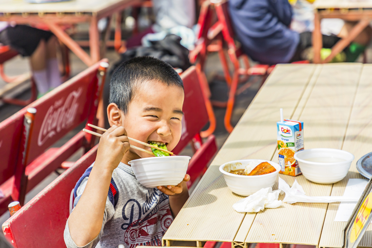 やると決まれば、感染予防対策は万全にしなければならない。密を避けられる屋外の果樹園を会場に選び、同居家族以外は近くに座らないように配席。マスク着用の上、検温と手指消毒を徹底した。メンバーが子どもたちの目の前で牛ステーキを焼き、炊き込みご飯やエビのチリソースをワンプレートに盛り付けて提供。171人の親子にいつもとはひと味違う食事を楽しんでもらった。
