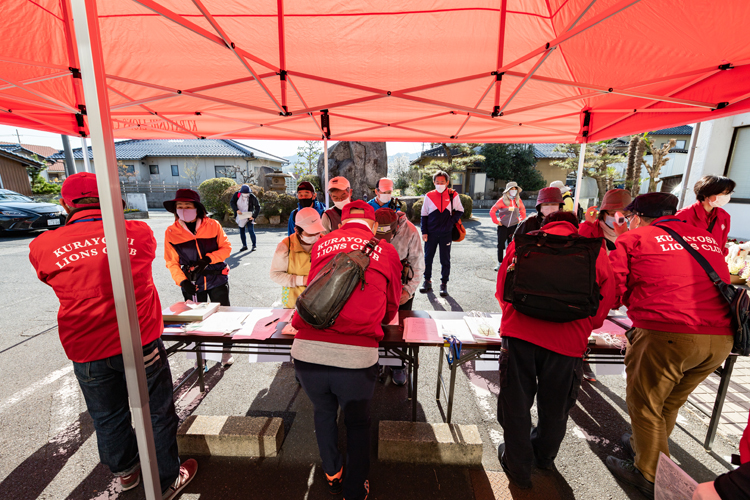 中国地方の最高峰、大山(だいせん)を遠望出来る桜並木は、1985年に廃線となった国鉄倉吉線のレール跡に設けられた遊歩道。赤いジャンパーを着たライオンズ・メンバーに率いられてウォーキングを楽しむのは、倉吉ライオンズクラブ(山本庄英会長/39人)が主催する「ふるさと再発見ウォーク」の参加者だ。ここまで約5kmの道のりを歩いてきてやや疲れが見えていたが、見頃を迎えた桜に元気づけられて足取りも軽くなったよう。この並木道を過ぎたら午前の部のコースが終わり、午後の部に備えてひと休みする。