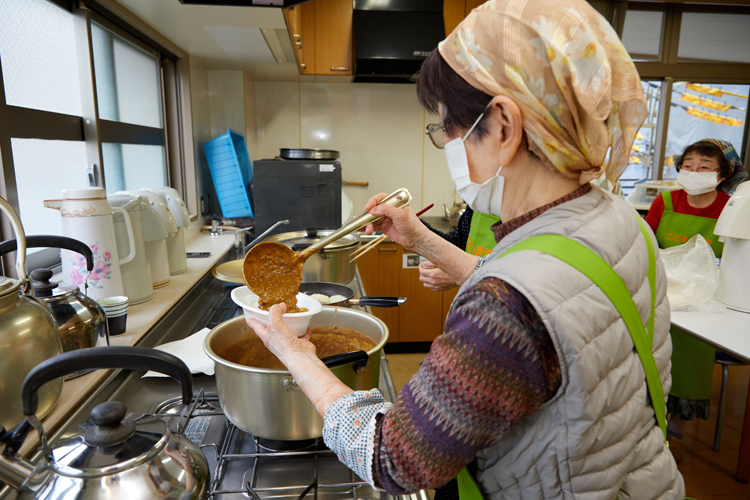 予約者向けのフードサポートに対して、こども食堂は当日思い立ってふらっと訪れた人も迎え入れる。この日、こども食堂・絆が用意したのは、カレーライスとニンジンしりしり、白身魚のフライの3品。カレーライスは前日に仕込んだものを寸胴鍋で持ち込み、ご飯とニンジンしりしりは公民館の厨房(ちゅうぼう)で調理した。白身魚のフライはフードサポートから提供されたものだ。大人の利用者から徴収した300円は、次回の食材購入に充てている。
