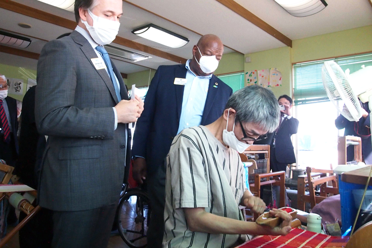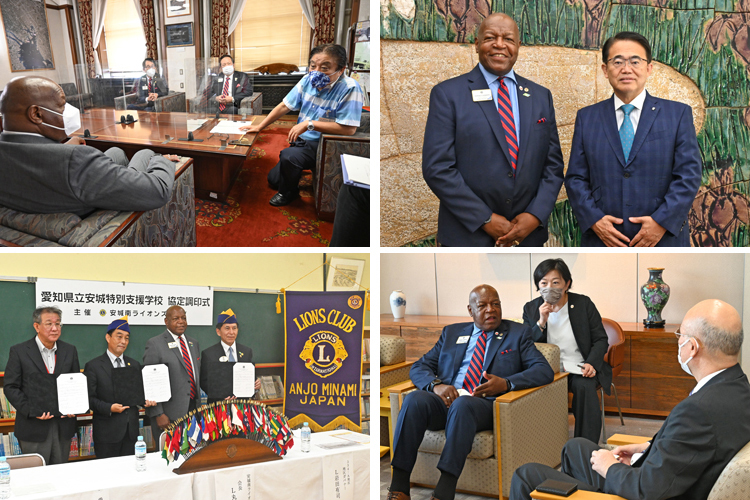 日本滞在中はこの他、愛知県安城市と山形県寒河江市でLCIF交付金事業の視察も行われた。6日午後には安城市の県立安城特別支援学校を訪問。同校と安城南ライオンズクラブ、334-A地区(愛知県)との三者による友好協力提携の調印式に参列した。安城南ライオンズクラブは特別支援学校をスポーツと食育の分野で支援しようと、スポーツ用品と調理器具を寄贈するため人道支援マッチング交付金を申請し、今年8月に承認された。クラブは今後も長期的に支援を続けようと協定を締結した。8日には、寒河江臥龍ライオンズクラブが長年にわたって支援を続けているさくらんぼ共生園を訪問。同園に対する支援には過去4回、LCIF交付金が拠出され、園舎の新築及び増築、就労機会を提供するカフェやグループホームの建設が行われている。アレキサンダー理事長は施設利用者による陶器や織物、絵などの創作活動の様子を見学し、交流した。