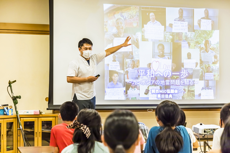 子どもたちがポスターを制作するのは夏休み中。そこで、平和授業は夏休みに入る直前に行うことにした。平和について具体的に考えてもらった上で、制作に取り組んでもらおうというのがクラブの狙いだ。授業を担当するのは、国際平和の問題や世界各地の紛争の現場に詳しい関西NGO協議会の栗田佳典事務局長。栗田さんは平和授業の第1回目から講師を担当している。