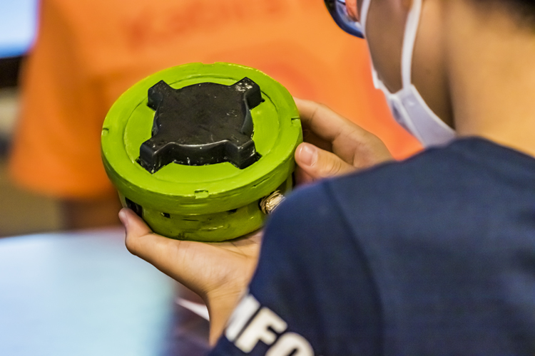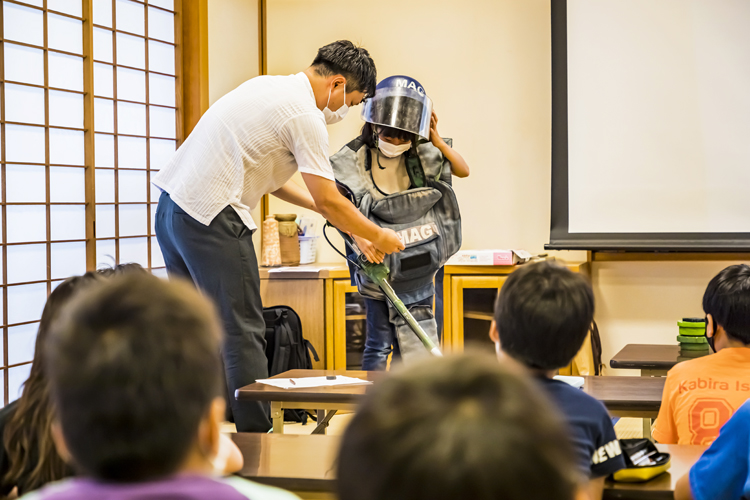 時間が限られているので、ポイントを絞ってその先を考えてもらえるように、事前準備には余念がない。栗田さんは、難しくなりがちな話を分かりやすく伝えるために内容を練り、具体的なイメージが湧きやすいように写真を豊富に使ったスライドを準備。また、この日は本物と同じ大きさの地雷のレプリカや地雷探知機、除去作業時に身に着けるヘルメットと防護服を用意し、子どもたちの関心を引き付けていた。